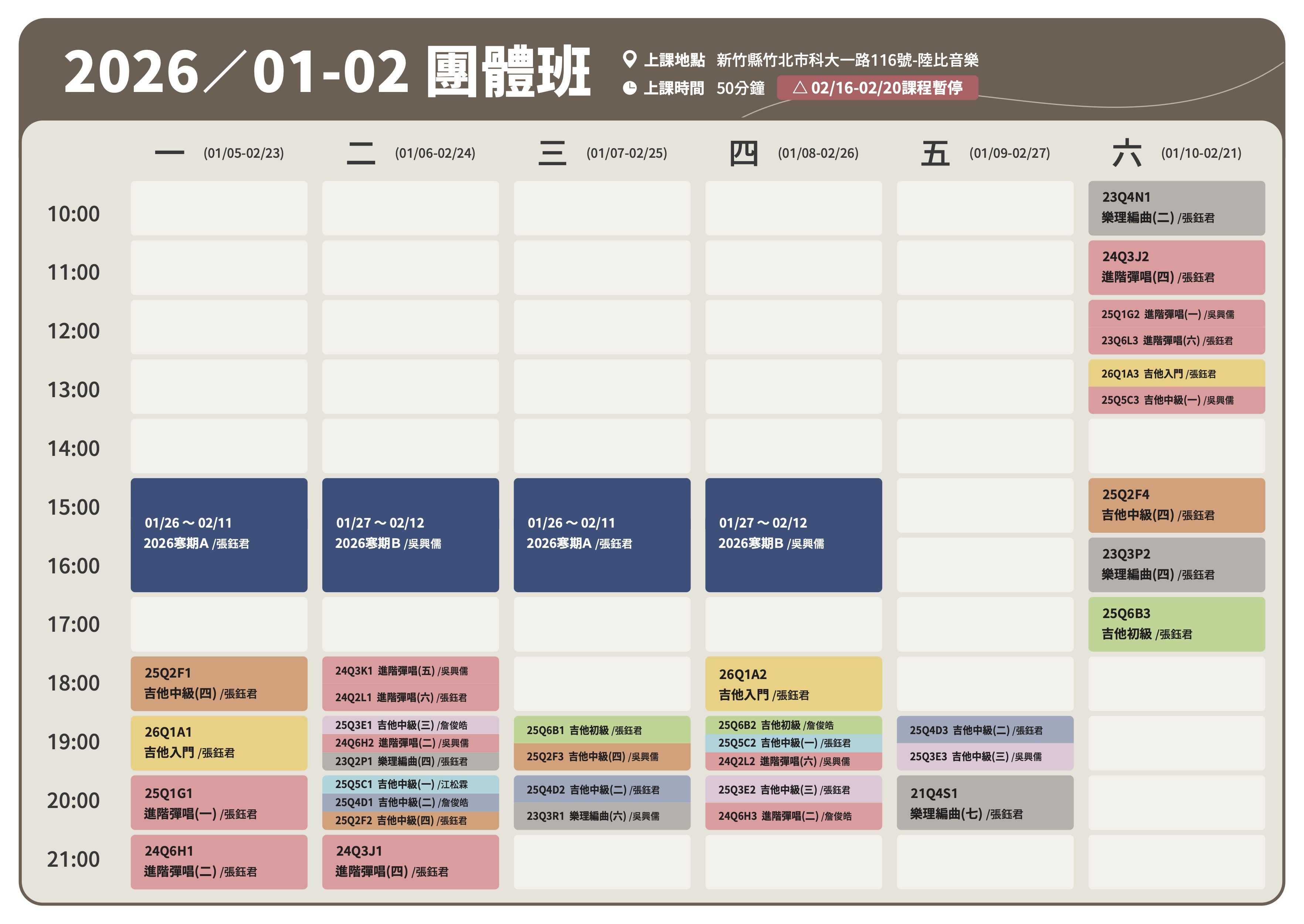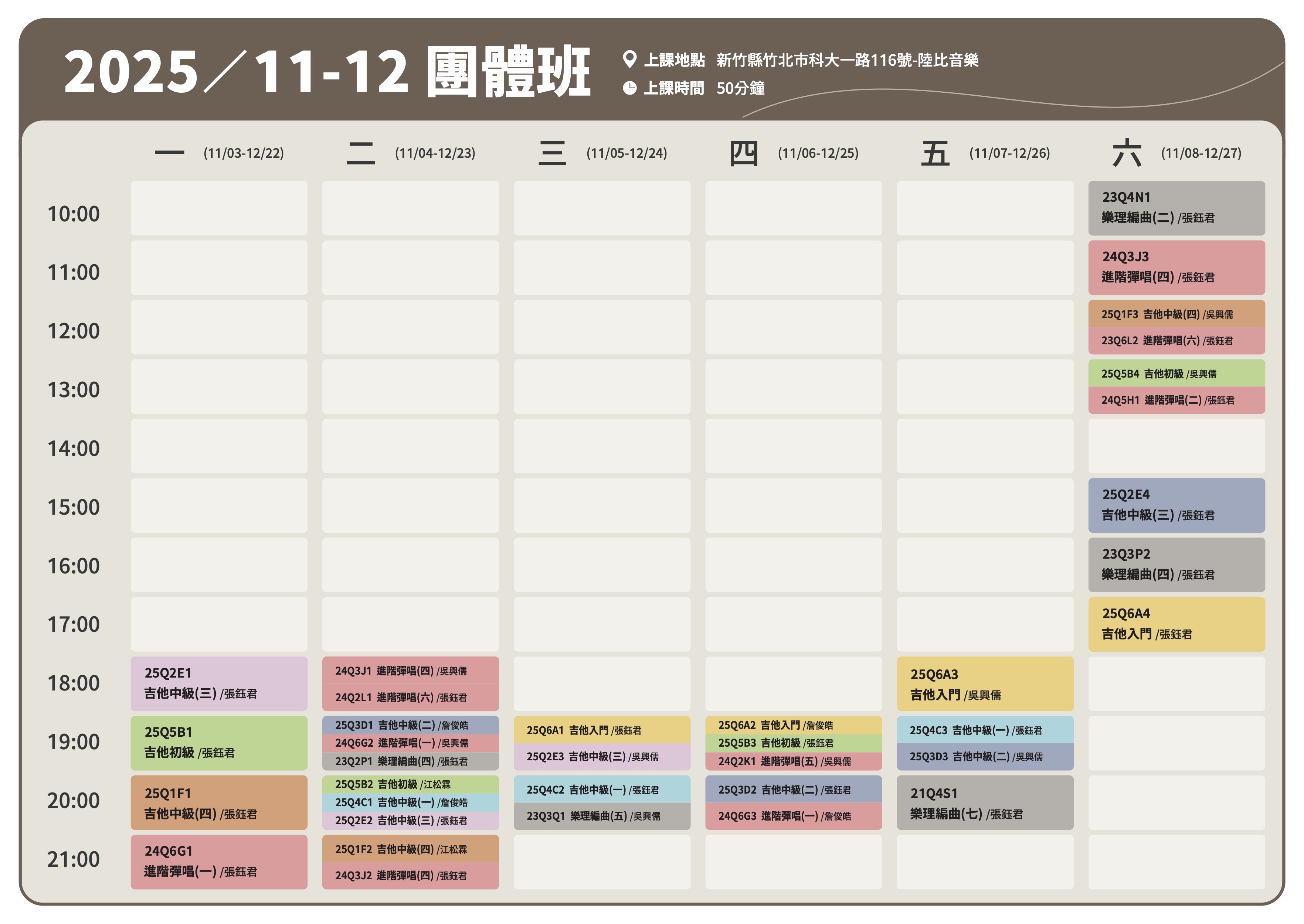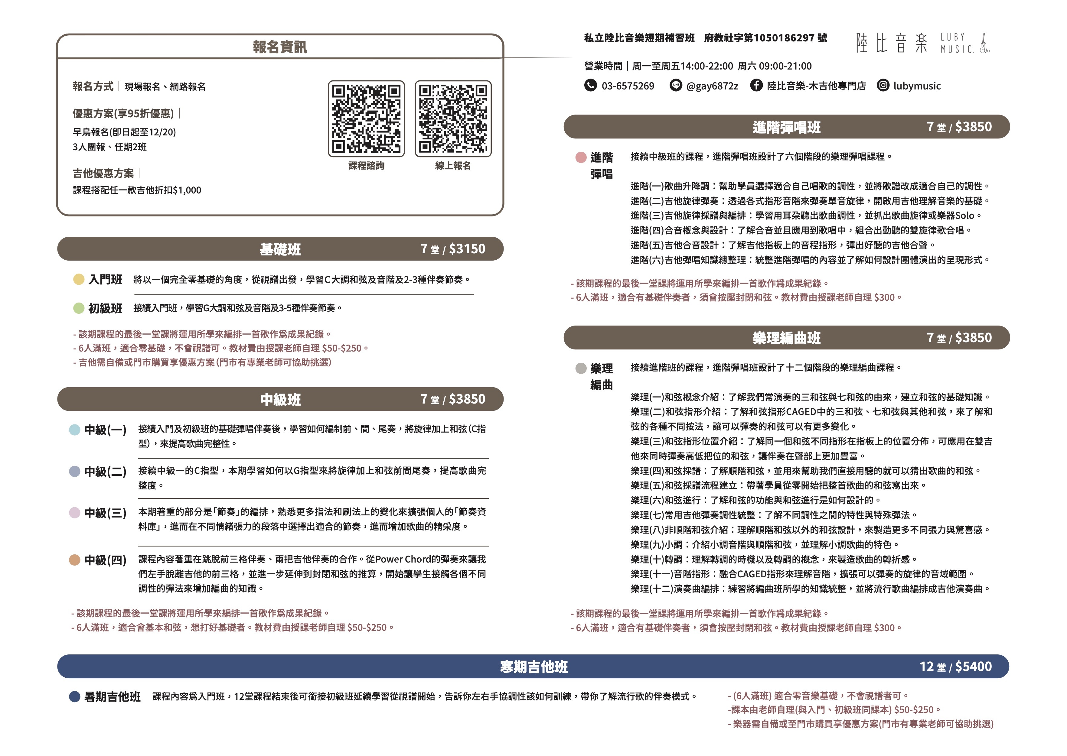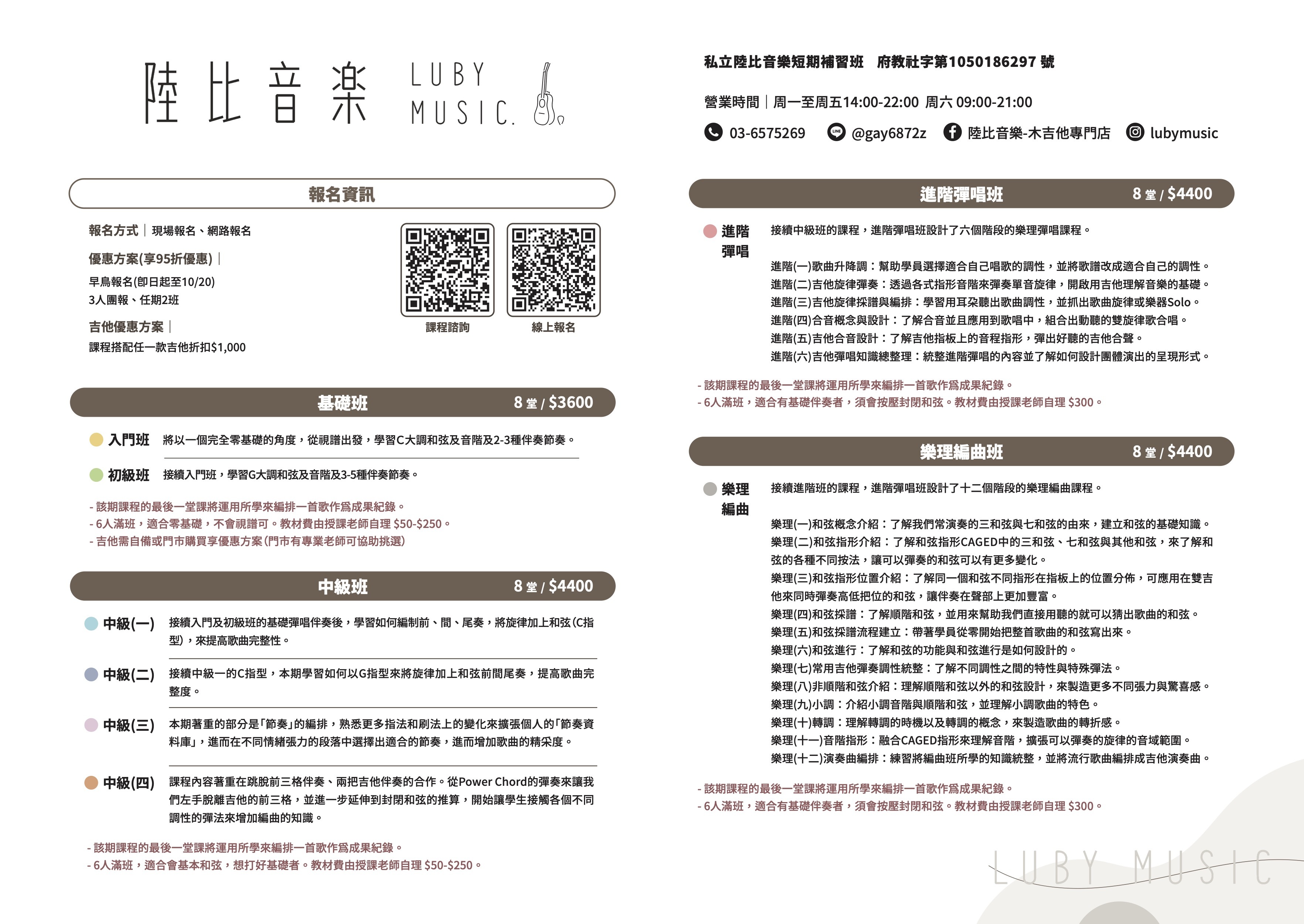 以完全初學者從入門班 8堂/期開始學習,至下期同時段會調整為初級班 8堂/期,再下期同時段會調整為中級班 8堂/期,中級班因內容較豐富多元,因此分為(一)(二)(三) (四)單元,共計 32 堂,讓每位學員都可以於同時段上到 一年(12 個月)共 48 堂的課程,打好吉他基礎。