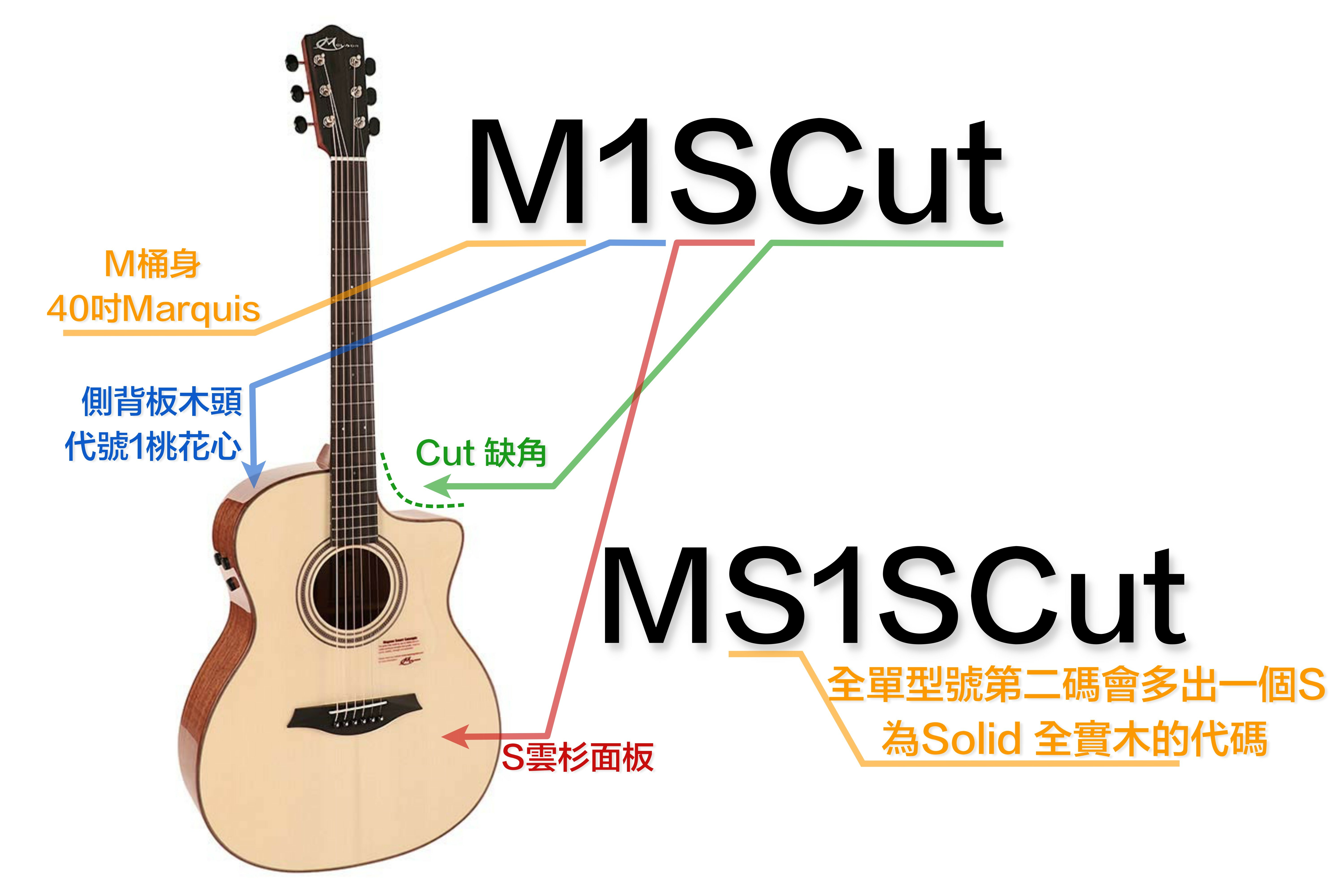 型號MS開頭為全單琴款,以MS1SCut為例,除了面板外,側板與背板皆使用全實木,整體音色表現優於面單款,指板與琴橋使用高端琴常用的黑檀木,搭配保護力更佳的硬盒💪,也有特別設計過琴頭鑲邊以及響孔外觀 ⬇️