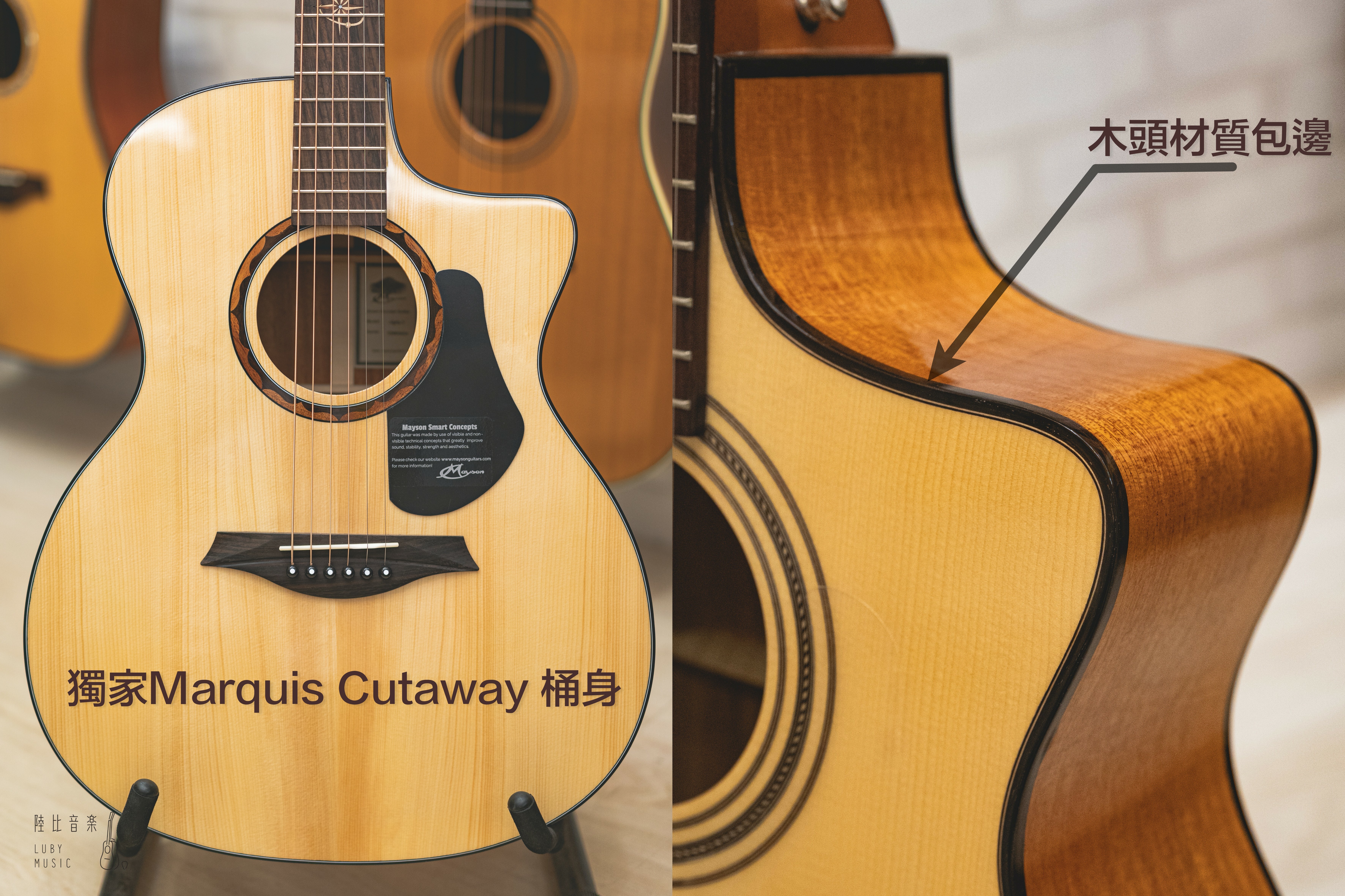Mayson獨家設計Marquis Cutaway桶身,非常類似GAC(Grand Auditorium Cutaway)桶身,40吋桶身適合所有男女青少年以上體型👫,各種曲風皆合適🎼