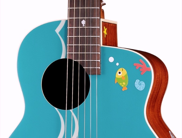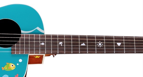 指板點設計,將Music Travel Love的核心精神化作喜愛的元素以「愛心、太陽、山、椰子樹、魚」等造型搭配貝殼材質鑲嵌。20格琴格讓彈奏音域更廣。