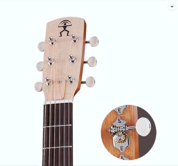 鳥吉他琴頭造型,楓木貼片搭配特殊印刷的aNueNue LOGO。使用1:16齒輪式弦鈕,轉動順暢,能有效的校正音準。