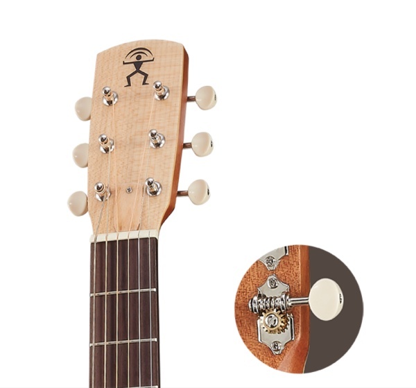 鳥吉他琴頭造型,楓木貼片搭配特殊印刷的aNueNue LOGO。使用1:16齒輪式弦鈕,轉動順暢,能有效的校正音準。