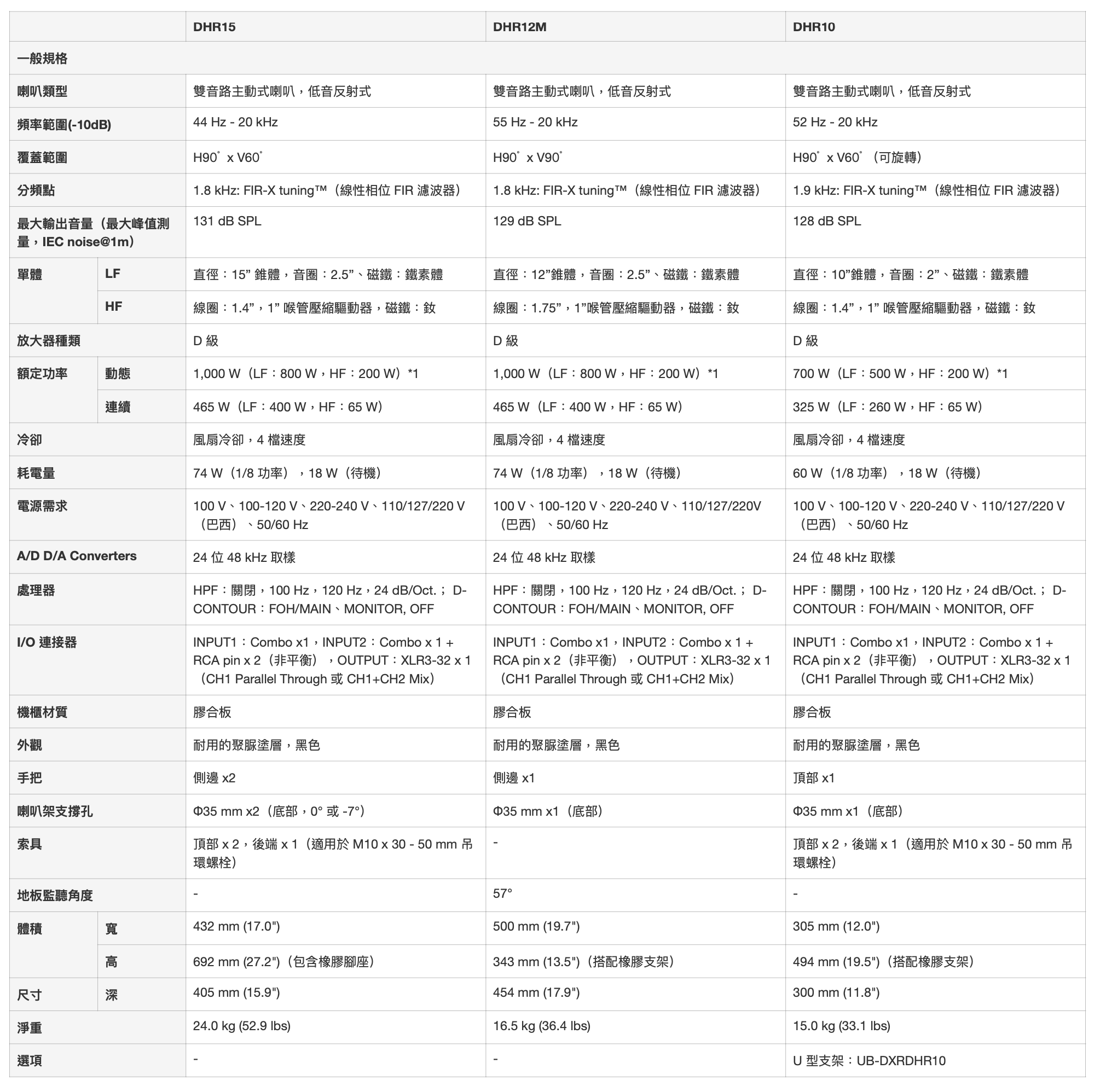 每種型號都已進行最佳化以滿足各種應用的需求;用於固定安裝、公共空間的 10" 、設計作為地面監聽的 12" 、適用 FOH 的 15" ,所有型號均配置了精選的客製化單體。DHR系列的單體由配備了DSP的D類擴大機推動,展現令人驚嘆的音質及清晰度,結合各種設計及實用功能,這兩個系列讓您可自由地為各種音響環境選擇理想的喇叭。這不就是您來提升音響效果的最好時機嗎?