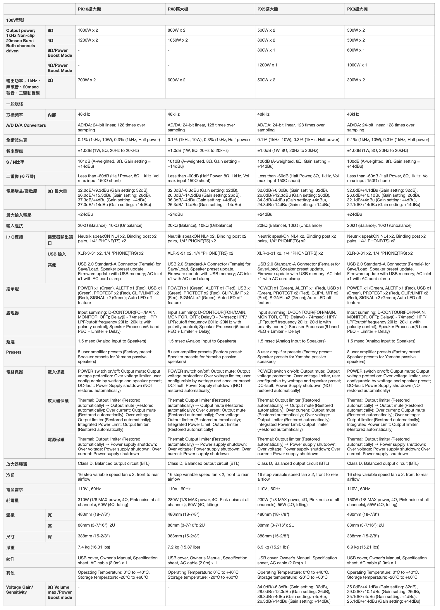 自從1976年發表的P2200,我們的第一台專業功率擴大機,Yamaha一直致力於實現在擴音,錄音室,和安裝工程中可能達到的最高水準的音質、輸出功率和性能的可靠性。新PX系列功率擴大機延續了這一個卓越傳統,採用Yamaha著名的數位信號處理技術和無與倫比的專業音頻技術,實現了輕量,堅固耐用的設計,能夠提供最大輸出功率給揚聲器,同時進行優化處理及保護性能。透過新開發的D類擴大機驅動的四款新型號所組成的PX系列適用於各種擴音和安裝工程環境。